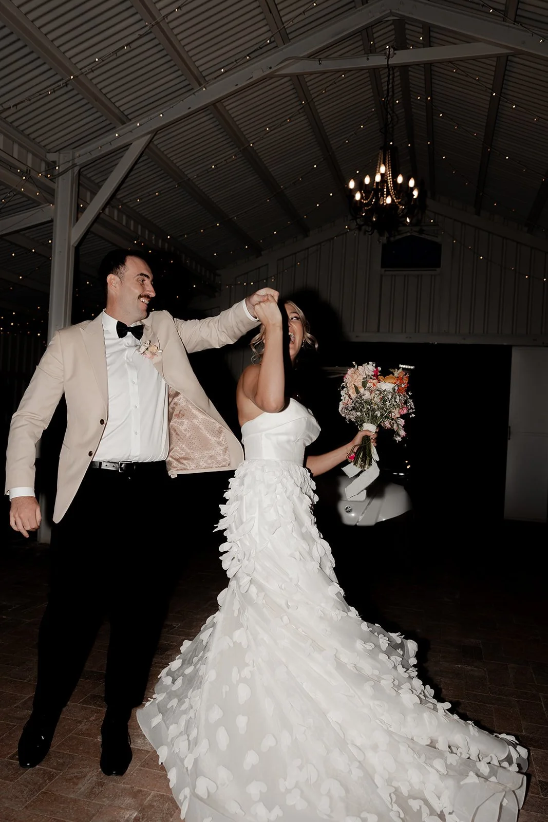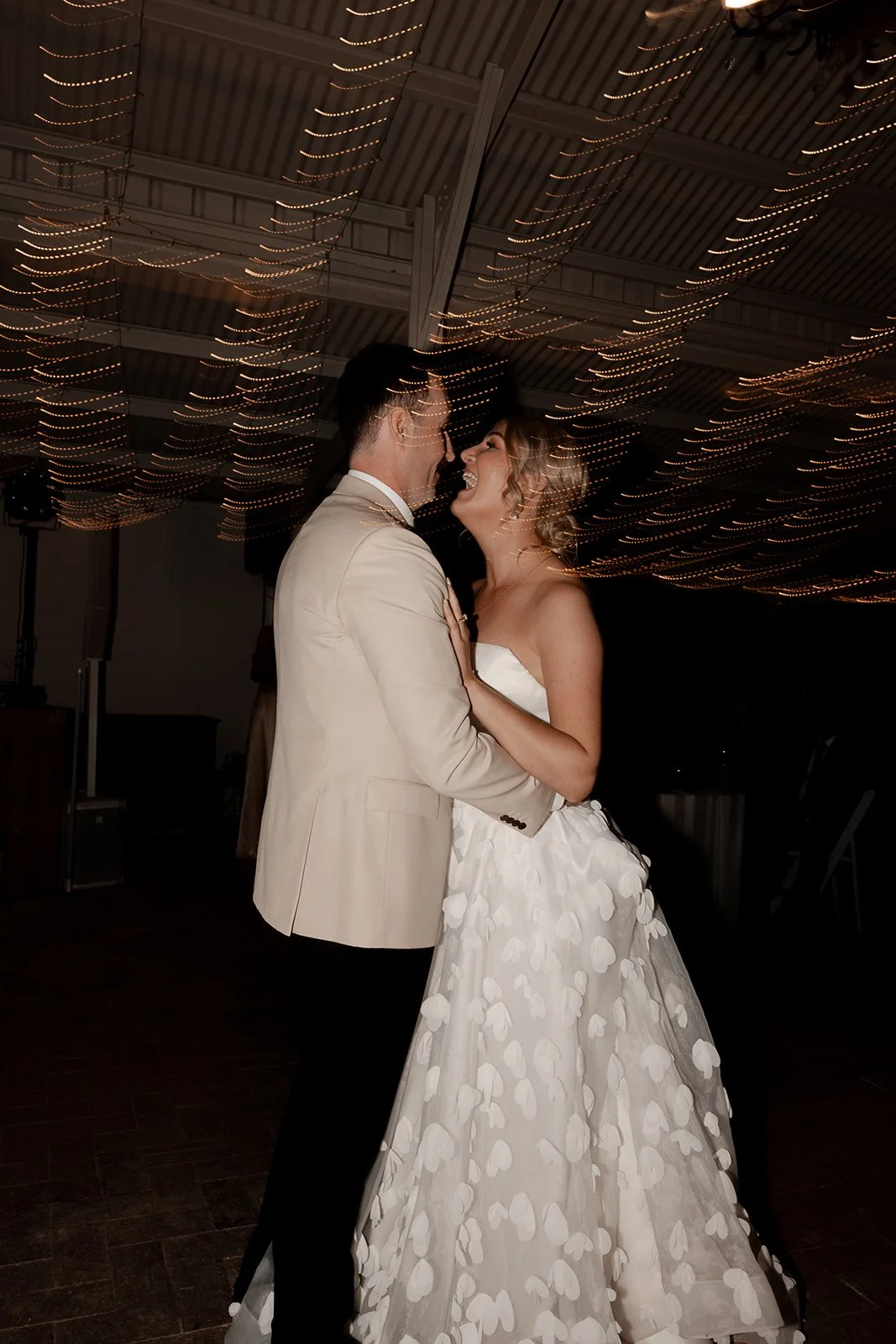 As twilight descended, twinkling fairy lights illuminated the dance floor, inviting everyone to join in the joyous celebration. The couple's first dance was a mesmerising moment, where time seemed to stand still as they swayed to their chosen melody. It wasn't long before family and friends joined them, filling the night with laughter, music, and dance under a canopy of the fairy lit barn.